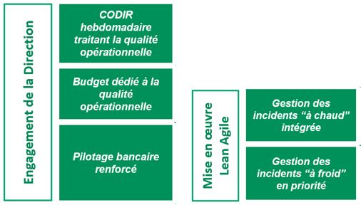 Le Codir hebdomadaire sur la qualité opérationnelle démontre aux cadres de la DSI l’importance attachée au sujet et donc la nécessité qu’eux se l’approprient et le portent auprès de leurs équipes. Le budget, lui, est indispensable pour financer les actions d’amélioration, qui ont eu lieu dans deux domaines :
