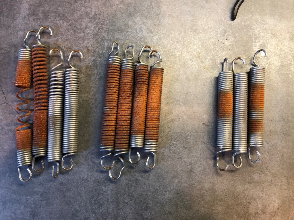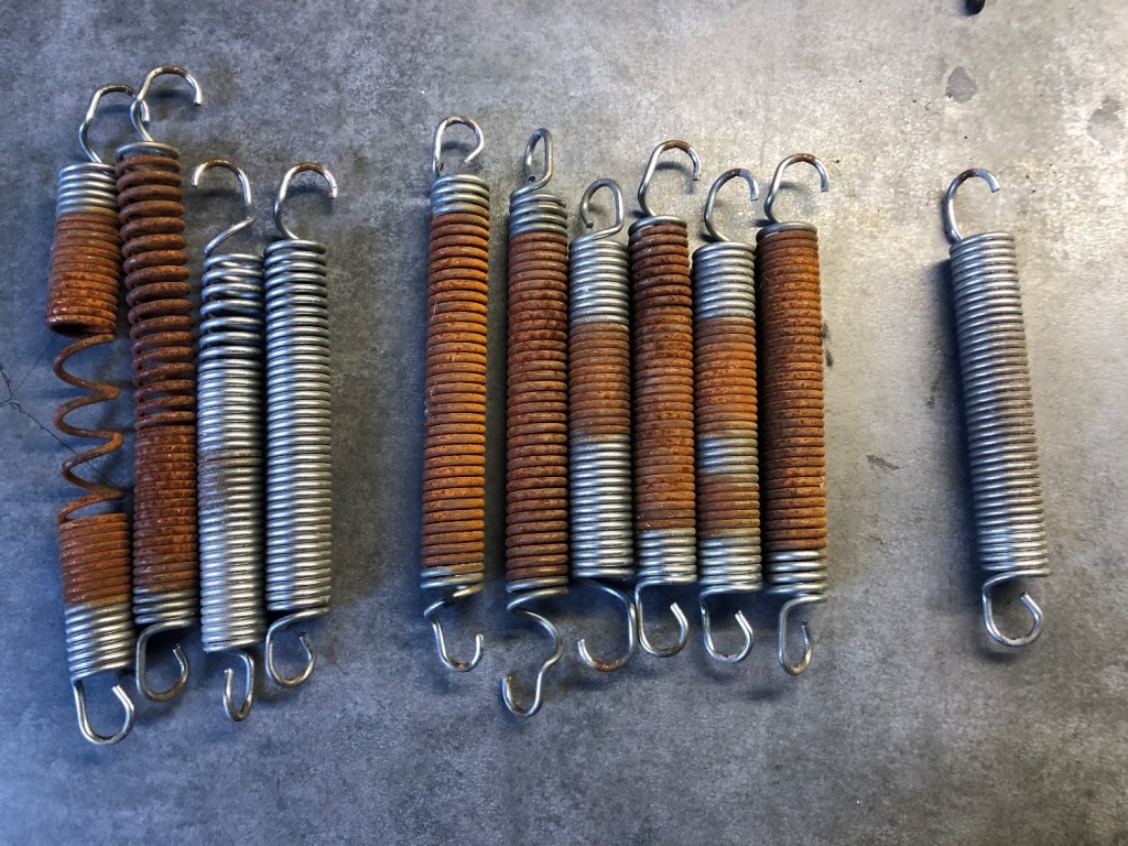 C’est exactement cela ! Rouillés ou chromés, ces trois-là ont exactement la même taille ! Ils ne sont pas du tout distendus ! Tous les autres sont plus grands ! En fait c’est cela mon critère OK : les trois ressorts à droite ont conservé leur taille d’origine, donc leur fonction de rappel ! J’aurais pu y penser avant…