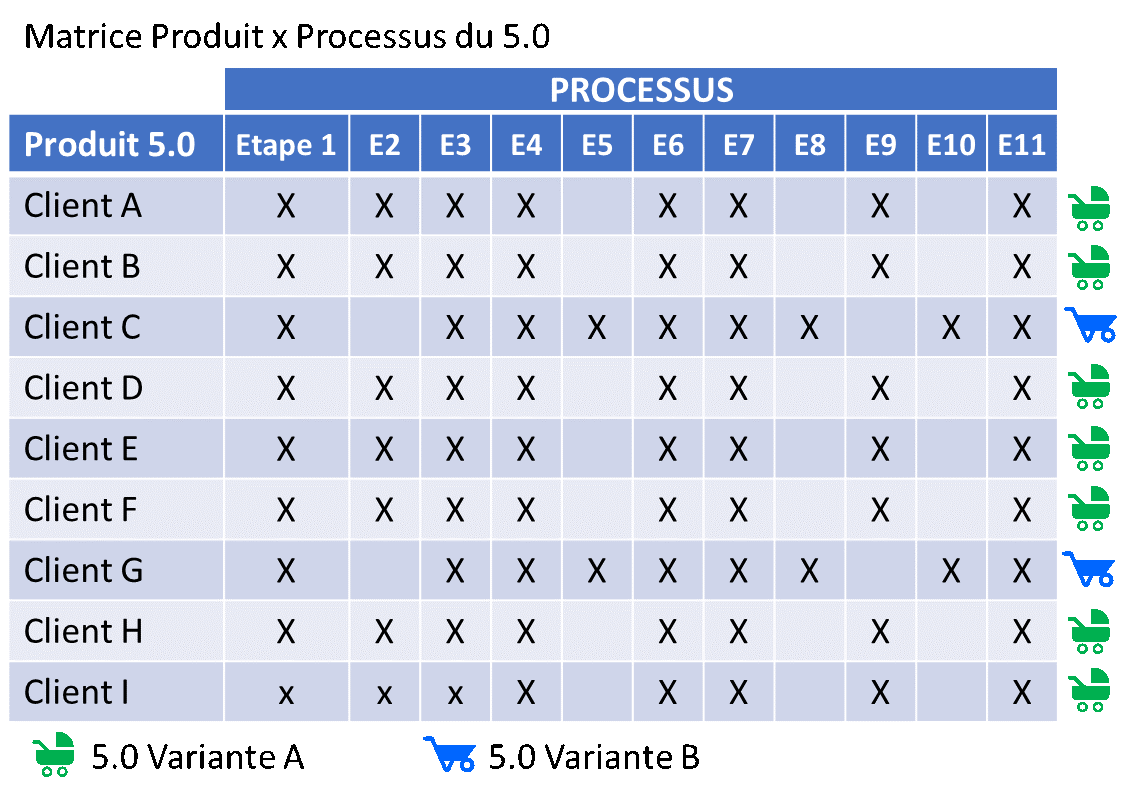 Dans notre exemple, il y a 2 variantes (ou familles) de notre produit 5.0. Ils ont 5 étapes communes et chacun 2 et 3 étapes spécifiques. La variante A est dite simple, car il n’y a pas de recours à l’intégrateur de nos clients. La variante B nécessite l’action de l’intégrateur du client. Elle est arbitrairement dite complexe car il y a plus d’étapes et plus d’acteurs.