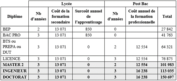 Utilisons par exemple la méthode fondée sur le coût de la scolarité ayant permis la professionnalisation des individus. Pour évaluer le capital initial, nous retiendrons les années de formation à partir de la classe de seconde, en cumulant les coûts successifs jusqu’au diplôme final. Le coût moyen de formation est obtenu à partir des données du rapport de l’OCDE relatif à l’éducation dans le monde (OCDE, 2014). Il date un peu, mais il ne s’est rien passé de révolutionnaire depuis.