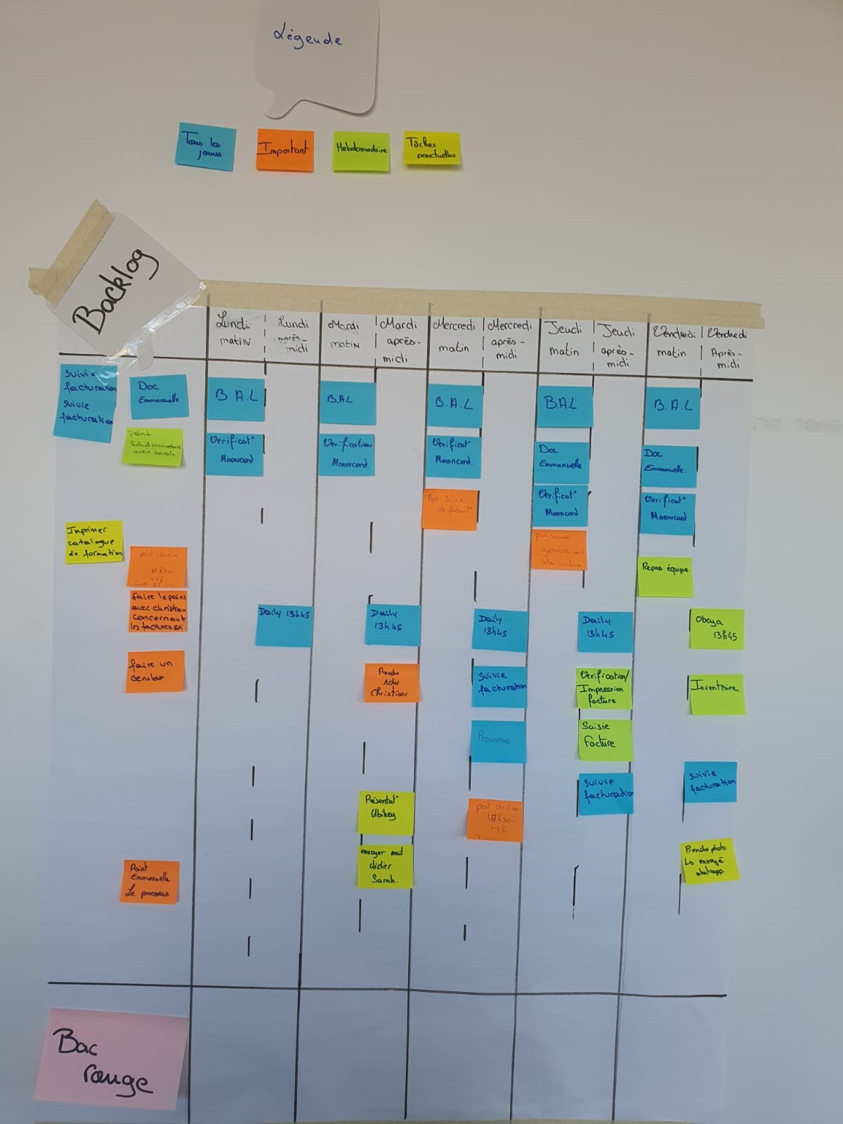 - enfin, les tâches qui étaient prévues dans la journée ou la semaine, mais qui n’ont pas pu être réalisées, se retrouvent dans le bac rouge.