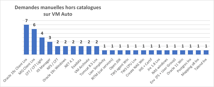 Comme nous l’avons vu, l’une des attentes principales est de permettre aux équipes projets (les utilisateurs) de disposer rapidement (en quelques minutes) des serveurs, environnements, et middlewares nécessaires pour livrer les applications aux utilisateurs métiers. Pour ce faire, ces composants doivent être disponibles au catalogue de l’outil. L’équipe s’est donc concentrée sur la mise à disposition des composants les plus fréquemment demandés en manuel (pas encore disponibles en automation). Ainsi, les attentes du client ont été capturées grâce à une analyse des données correspondant aux usages de l’outil.