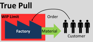 Un véritable système tiré ne démarre la production que si la limite de travail en cours n’a pas encore été atteinte. Par exemple, dans un système kanban, s’il y a du matériel dans le supermarché à la fin, le client peut prendre une pièce et une nouvelle commande est générée. S’il n’y a pas de matériel, tout le travail en cours autorisé est déjà dans la file d’attente. Le client ne reçoit aucune pièce et aucune nouvelle commande n’est produite.