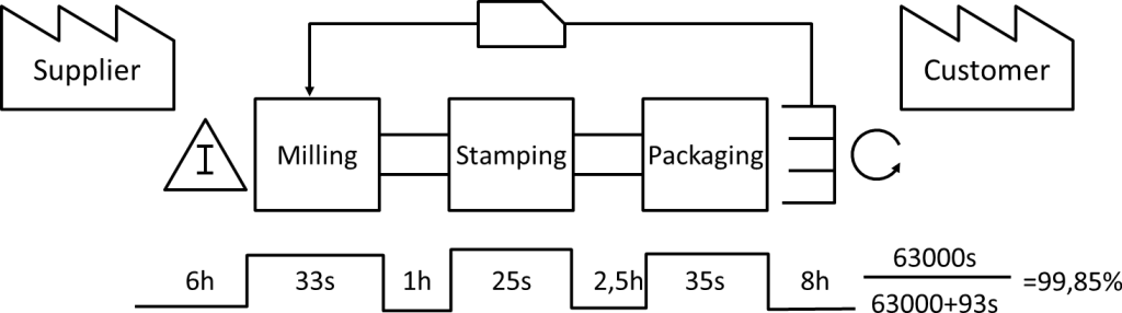 En même temps, il est difficile de voir une usine qui mesure réellement ce débit. Ce qui s’en rapproche le plus, peut se retrouver dans la chaîne de valeur où l’on peut tracer le pourcentage de temps pendant lequel une pièce est traitée par rapport au délai de livraison total. Le diagramme de flux de valeur simplifié présenté ci-dessous comporte une ligne ascendante/descendante en bas de la figure, où sont ajoutés les temps de traitement et les temps d’attente pour une pièce donnée. Ici, la pièce attend environ 6 heures dans l’entrepôt d’arrivée, avant d’être fraisée pendant 33 secondes, puis d’attendre encore une heure pour 25 secondes d’estampillage.