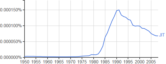 Le sujet du JAT en particulier a commencé à prendre de l’ampleur vers 1980 mais a atteint son apogée en 1990. Depuis, il est toujours présent mais est moins fréquemment mentionné dans les publications. Le graphique Google Ngram ci-dessous montre l’occurrence du JIT dans la littérature anglaise au fil du temps, et le pic de 1990 est clairement visible.