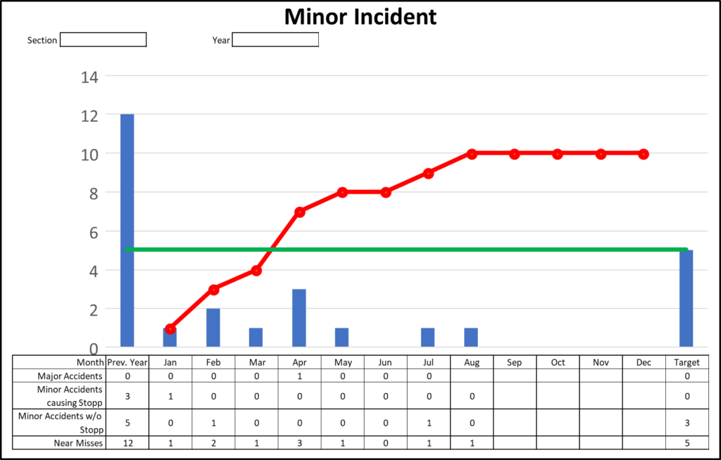 Une feuille très similaire peut être utilisée pour suivre les incidents mineurs, avec également les chiffres de l’année dernière, les objectifs, les incidents mensuels et une ligne cumulée. Vous trouverez ci-dessous un exemple, toujours avec des données complètement fictives.