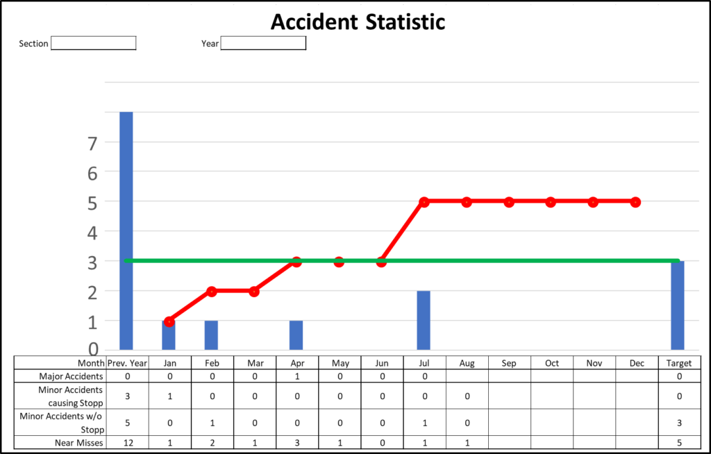 Ensuite, on trouve généralement un aperçu de l’année écoulée, montrant par exemple le nombre d’accidents de l’année passée, l’objectif et le nombre d’accidents mensuels. Une ligne cumulée compte le nombre d’accidents survenus depuis le début de l’année et indique clairement si l’objectif peut être atteint ou si la ligne cumulée s’approche ou même dépasse l’objectif. Souvent, ces valeurs permettent de distinguer s’il s’agit d’un accident majeur avec arrêt maladie, d’un accident mineur ayant provoqué un arrêt de ligne, d’un accident mineur n’ayant pas provoqué d’arrêt de ligne ou d’un presqu’accident. Par leur nature, les presqu’accidents sont souvent sous-estimés, mais il existe au moins une tentative pour les détecter. Après tout, statistiquement parlant, 20 presqu’accidents provoquent un accident mineur, 3 accidents mineurs provoquent un accident grave et 10 accidents graves provoquent un décès. Par conséquent, tenter de remédier aux presqu’accidents peut contribuer à prévenir des accidents mineurs ou majeurs. L’exemple ci-dessous montre à quoi ressemble l’une de ces feuilles, mais bien sûr il s’agit là de données fictives.