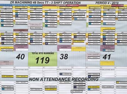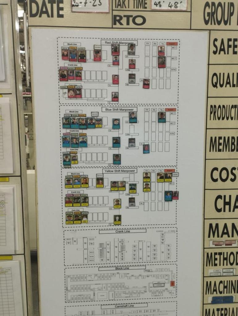 Une partie de la planification d’un atelier de production consiste à affecter, quotidiennement, les opérateurs à chaque machine. Voici quelques exemples provenant de l’usine de moteurs de Toyota UK Deeside. Toyota utilise généralement des cartes magnétiques portant le nom des employés (et parfois une photo) donc faciles à utiliser. Les illustrations ci-dessous présentent les différentes possibilités d’utilisation de ces cartes lors de l’affectation des tâches.