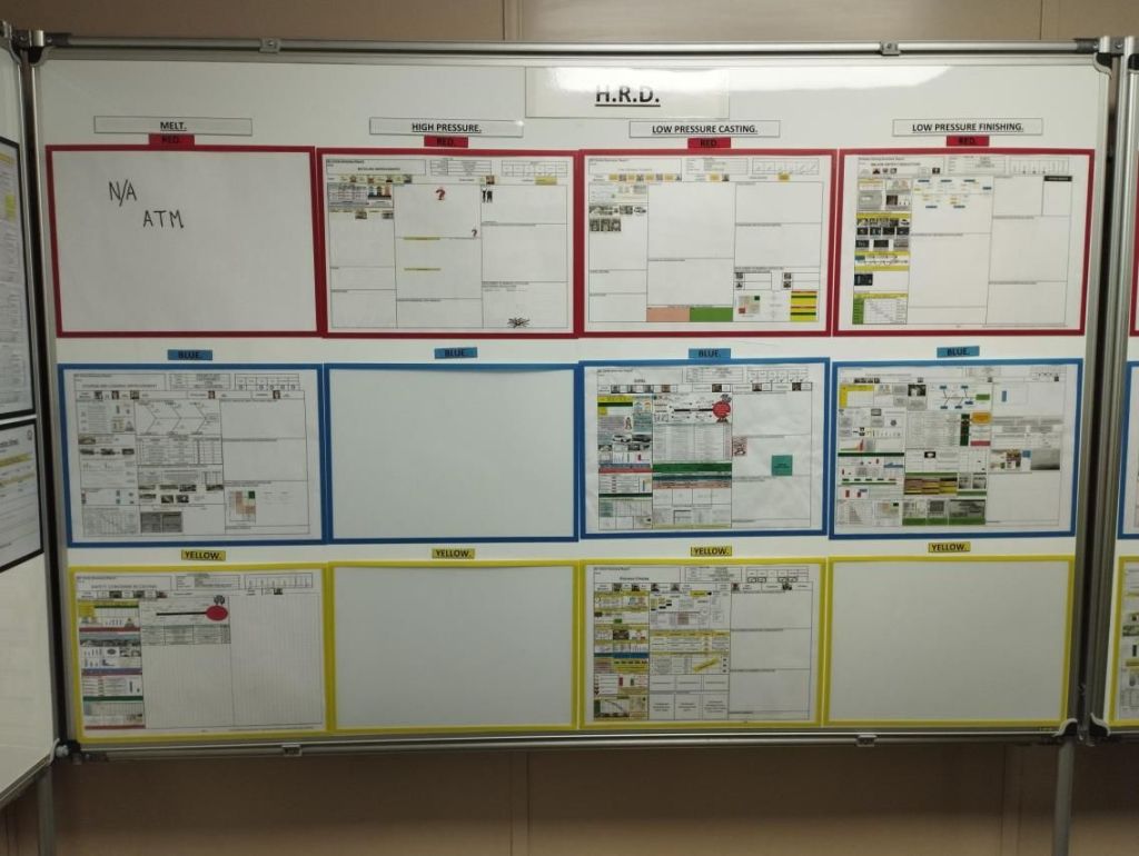 Ci-dessous un autre exemple de plusieurs A3 sur un tableau de bord pour le département de moulage de l’usine de moteurs de Toyota UK Deeside. Il y a un A3 pour chaque équipe (rouge, bleu, jaune) et pour chaque type d’activités du département. A savoir, un A3 sur la fusion, sur la coulée à haute pression, sur la coulée à basse pression et sur la finition à basse pression. Alors que l’exemple ci-dessus est la feuille d’un A3 terminée, les exemples ci-dessous sont à différents stades d’achèvement, entre le début et le suivi des résultats.