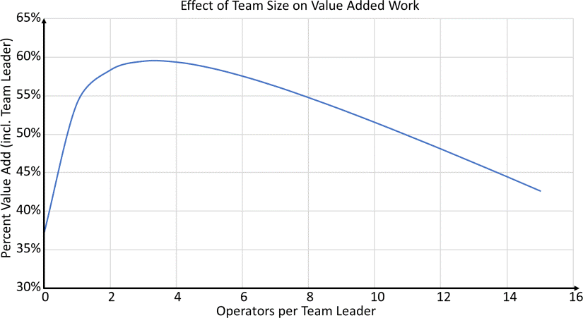 L’un des facteurs qui influence l’efficacité est la taille du groupe de niveau le plus bas sur la ligne d’assemblage. De combien d’opérateurs un chef d’équipe est-il responsable ? Il semble qu’un groupe plus petit offre un soutien plus rapide et de meilleure qualité aux opérateurs, ce qui augmente l’efficacité. Une taille de groupe entre deux et six opérateurs par chef d’équipe semble être idéale (cf mon billet sur la structure des équipes chez Toyota).