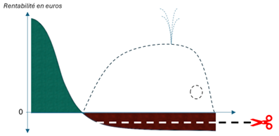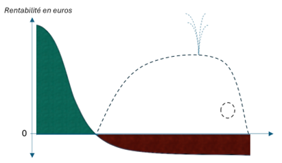 Vous me croirez sur parole si je vous affirme, la main sur le cœur, que l’aire verte représente 122,3 % de l’aire rouge, ce qui donne un ratio [EBIT]/[Chiffre d’affaires] de 10 %. Nous pouvons donc observer qu’il existe des prestations très rentables qui épongent un plus grand nombre de prestations à la rentabilité… négative !