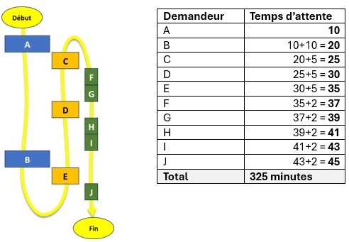 Chaque demandeur attend son temps de traitement additionné au temps de traitement de ceux qui l’ont précédé dans sa file. La somme des temps d’attente est de 325 minutes.