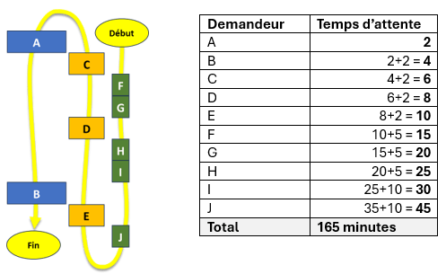 Chaque demandeur attend son temps de traitement additionné au temps de traitement de ceux qui l’ont précédé dans sa file. La somme des temps d’attente est de 165 minutes.