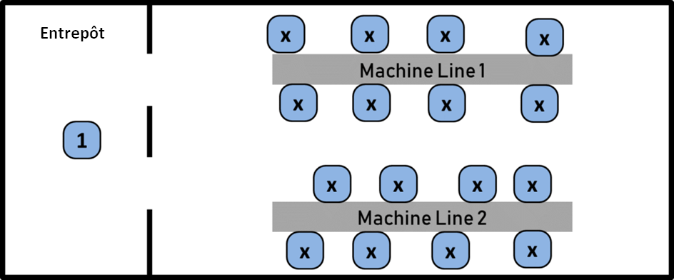 Pour les lignes d’assemblage ou les cellules, vous devez réfléchir aux endroits où vous voulez vous arrêter. Le mieux est de prendre une impression A3 du plan et de parcourir l’atelier, en réfléchissant aux endroits où vous avez besoin de pièces. Cela peut également dépendre d’autres éléments logistiques. Par exemple, si vous avez une centralisation des fournitures (également appelé araignée d’eau ou, en japonais, misuzumashi) qui apporte les pièces d’un petit supermarché proche de la ligne aux machines et aux emplacements d’assemblage, vous n’aurez peut-être besoin que d’un seul arrêt avec un supermarché pour une ligne. Si, par contre, la tournée du laitier est la dernière étape logistique avant l’assemblage de la pièce, vous aurez probablement besoin de plusieurs arrêts le long de la cellule ou de la ligne.